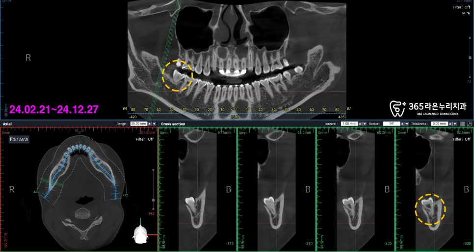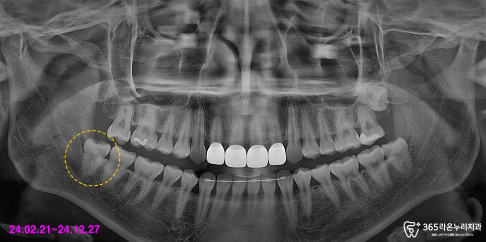 오른쪽 아래턱의 맨 뒤 사랑니가 관찰되는데,