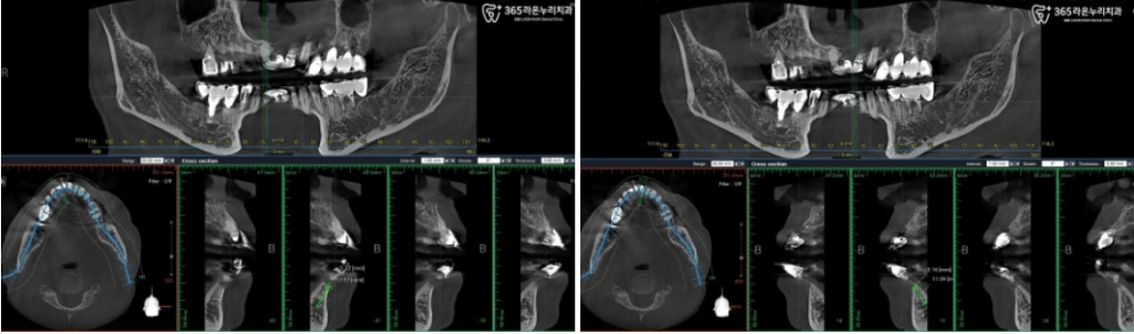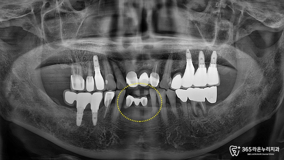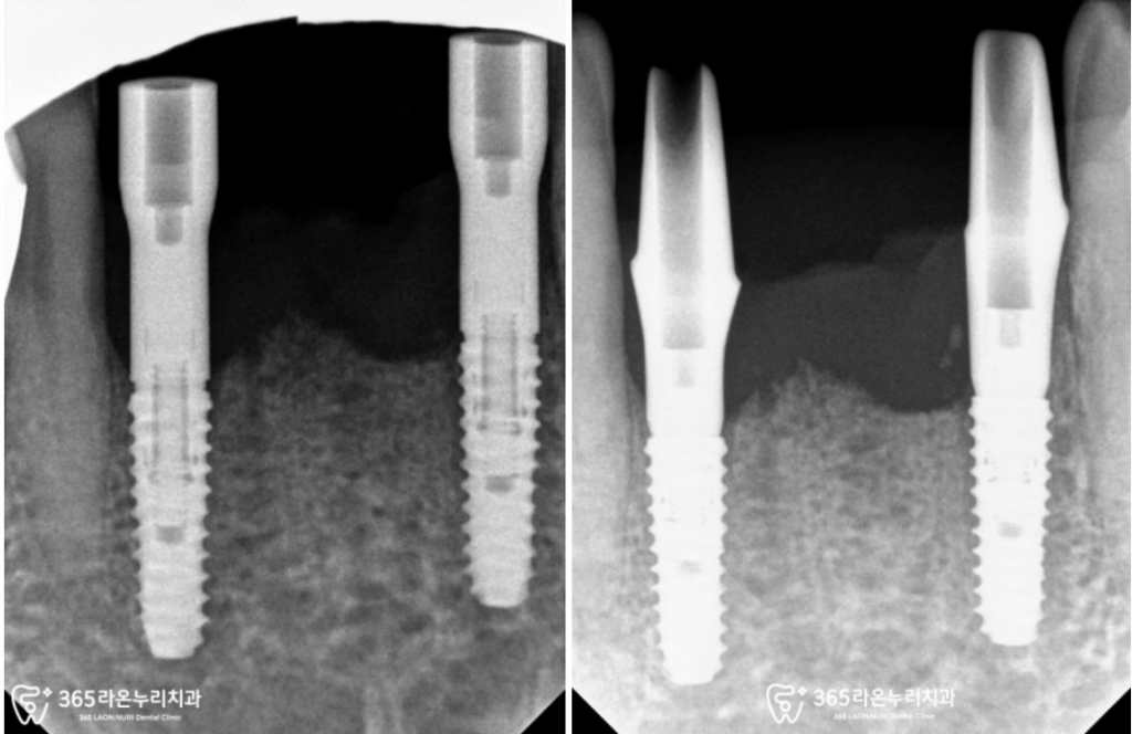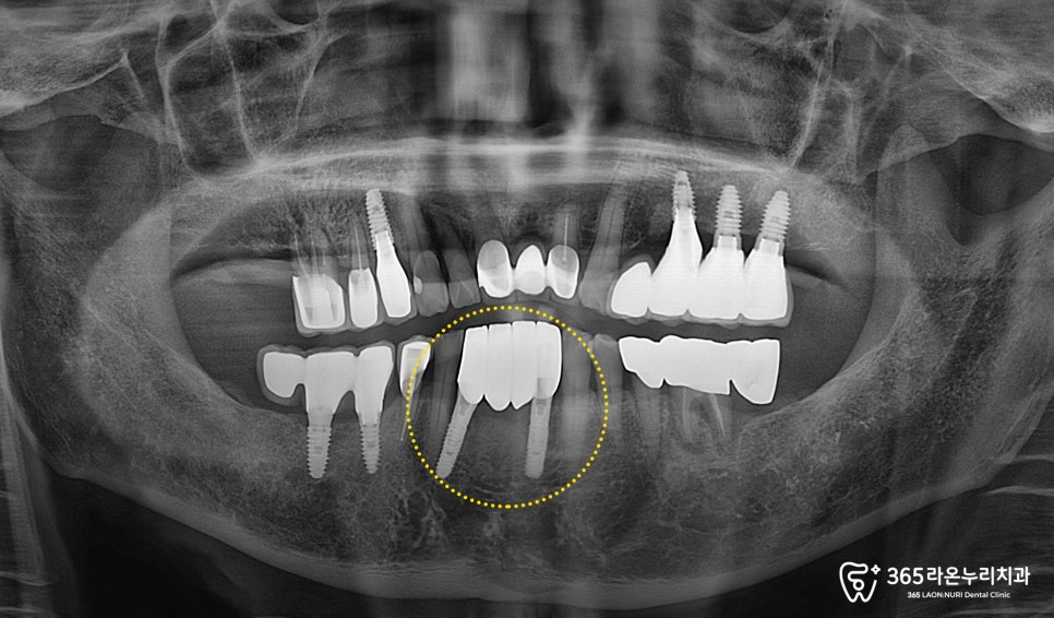 오산 신장동 치과 에서 보철 아래 치아 흔들림 통증 치료 받은 사례_심한 골흡수로 발치 및 앞니 임플란트 수술 후 임시 치아 제작까지