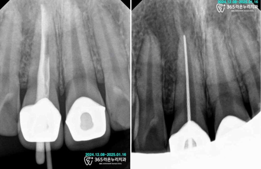 앞니 잇몸 고름 으로 인한 통증 신경 치료 후 임시 치아 제작 다음 최종 크라운 완성한 오산역 치과
